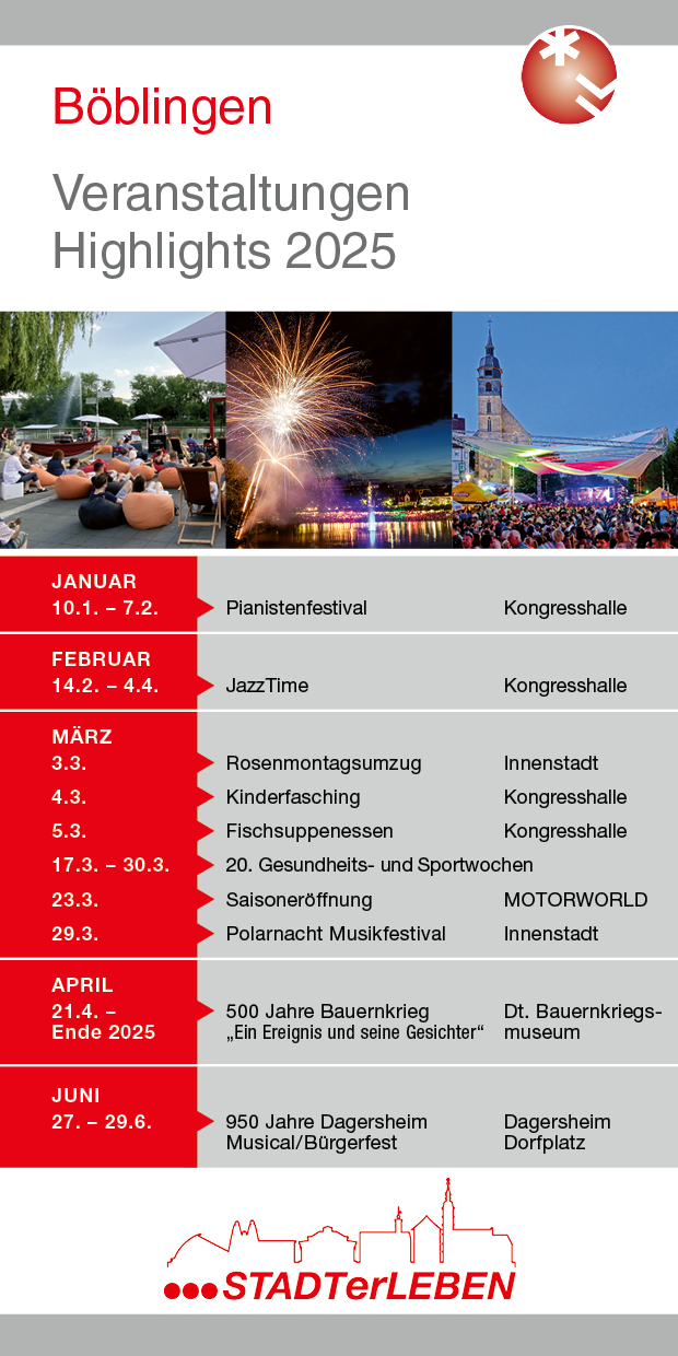 Böblingen hat viel zu bieten. In unserer Jahres-Übersicht präsentieren wir Ihnen die wichtigsten Veranstaltungen in Böblingen.