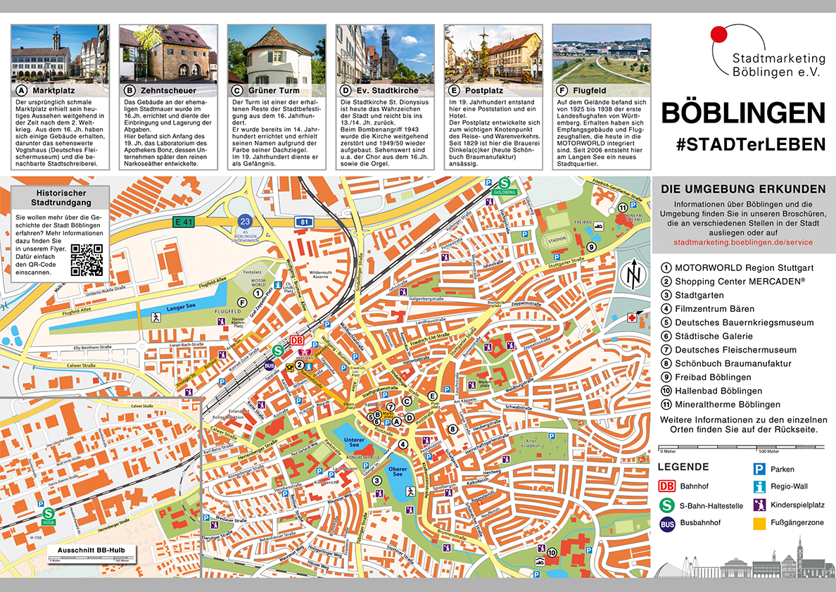 Unser Stadtplan bietet einen schnellen Überblick über die Stadt Böblingen, Straßen und Gebäude sowie die Sehenswürdigkeiten und Freizeitangebote. Den Plan erhalten Sie in Böblinger Hotels und Gastronomiebetrieben, bei der Stadtverwaltung Böblingen sowie hier digital zur Ansicht und zum Download.