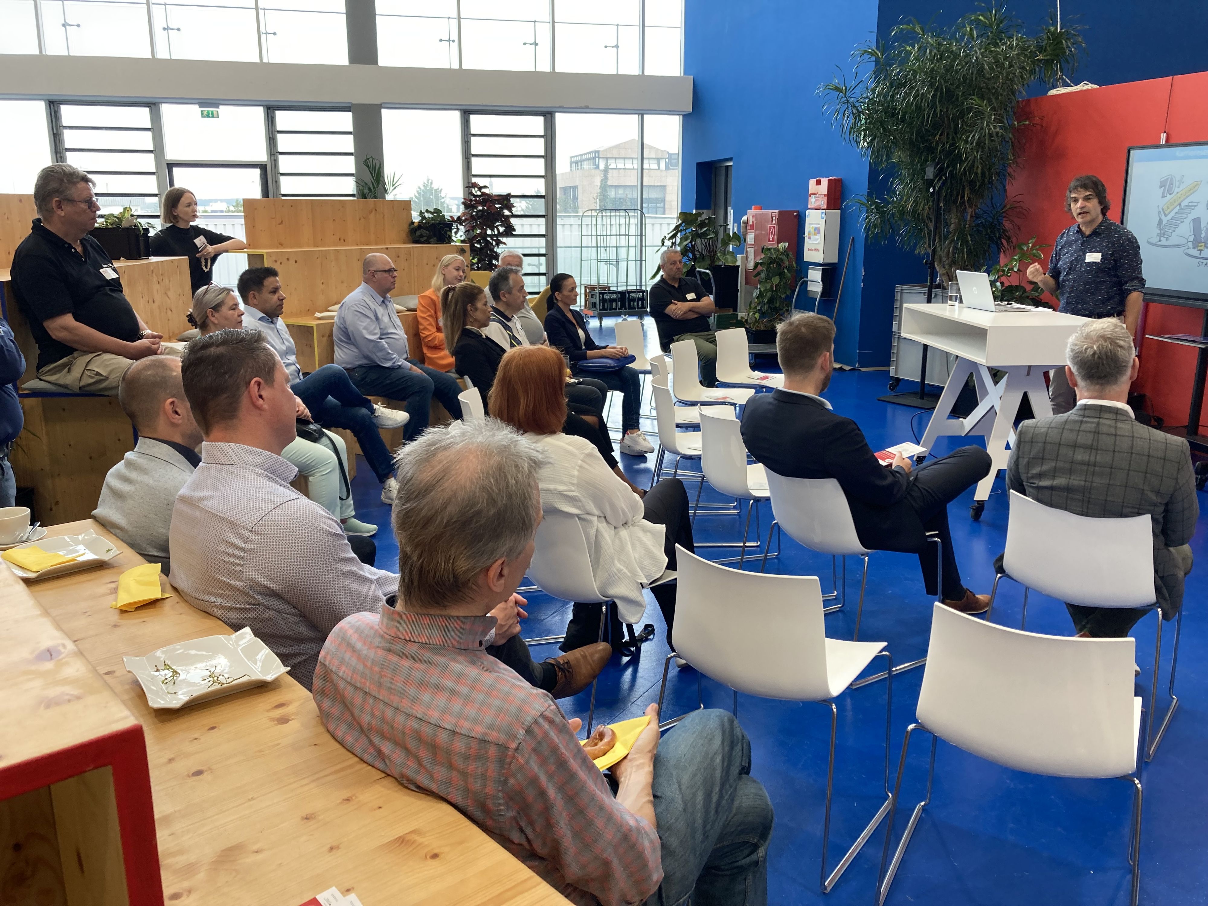 Das Businessfrrühstück des Sadtmarketing Böblingen führte am 23. Juni zu optiplan GmbH daten & druck. Geschäftsführer Stefan Reger und sein Team präsentierten den rund 45 Teilnehmerinnen und Teilnehmern in mehreren Stationen das vielseitige Tätigkeitsfeld des Unternehmens im Bereich Werbetechnik, Präsentation und Vervielfältigung. Besonders eindrucksvoll war der Druck auf starren Platten, von dem sich alle Teilnehmer:innen mit einem kleinen Erinnerungsstück überzeugen konnten. Zudem konnten die emissionsfreie Cargo E-Bikes von XCYC getestet werden; einer Marke der GWW - Gemeinnützige Werkstätten und Wohnstätten GmbH. Montiert wird das emissionsfreie Cargo E-Bike von und mit Menschen mit Behinderung in Calw.
