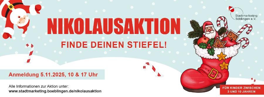 Für die Vorweihnachtszeit hat sich das Stadtmarketing Böblingen wie im letzten Jahr etwas ganz Besonderes für alle kleinen Böblinger*innen überlegt. Nach der durchweg positiven Resonanz in den letzten Jahren dürfen sich alle wieder auf die Nikolausstiefelaktion freuen. Die Idee der Nikolausaktion ist, dass Kinder zwischen 3 und 10 Jahren ihre Stiefelchen beim Stadtmarketing abgeben können und diese anschließend an die Böblinger Geschäfte verteilt werden. Die teilnehmenden Geschäfte befüllen die Stiefelchen mit weihnachtlichen Leckereien und stellen sie in ihrem Schaufenster aus.